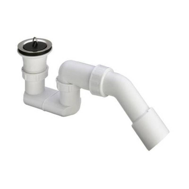Syfon, łuk odpływowy 45°, górna część zaworu ze stali nierdzewnej, korek do zaworu