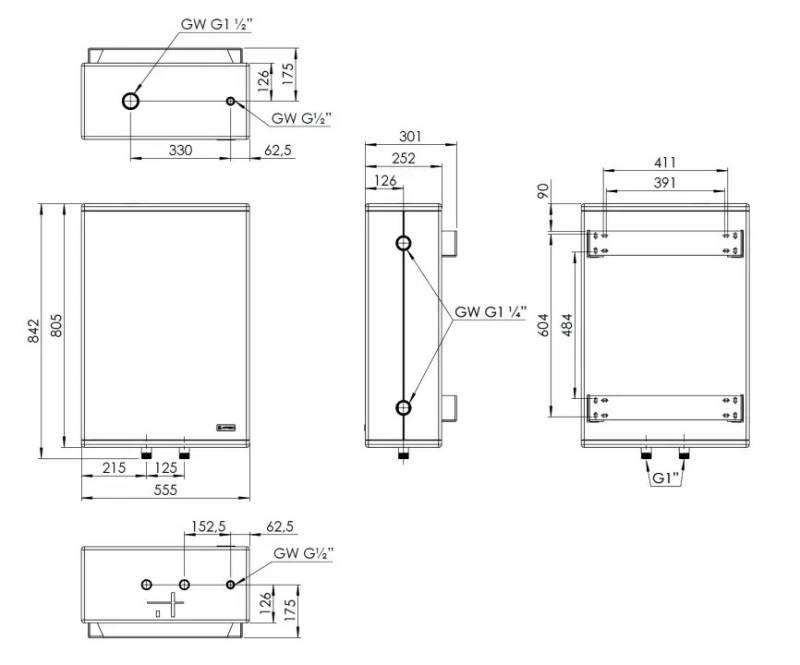 przyłącza źródła ciepła 2: 2x Rp1¼"